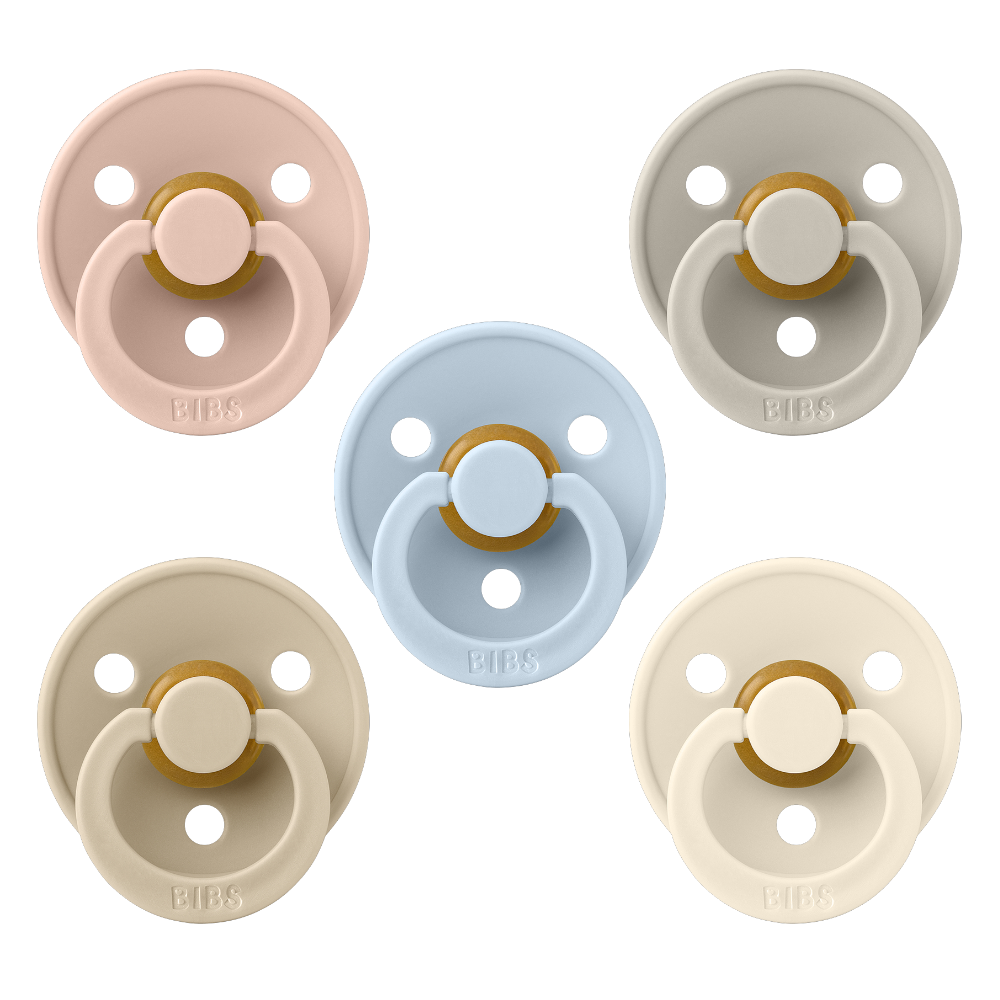 Each bag includes 25 pacifiers in a mix of 5 colours. The quantity of each colour in a bag will vary (and in rare cases, not all 5 colours may be in a bag)