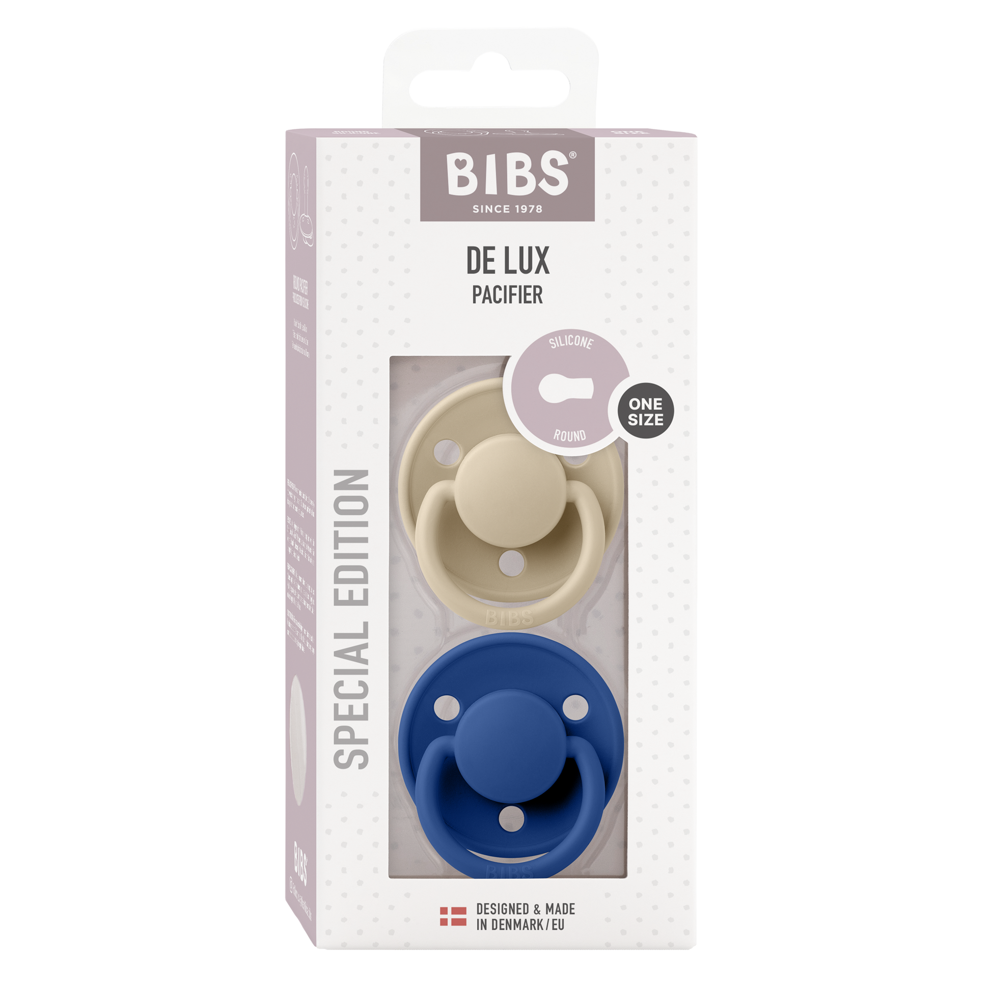 De Lux is a modern and timeless pacifier, with an elegant hidden gathering in an enhanced matte finish for a Premium look. The dup is made large, so it is easy to print a name on, making it perfect for daycare.
